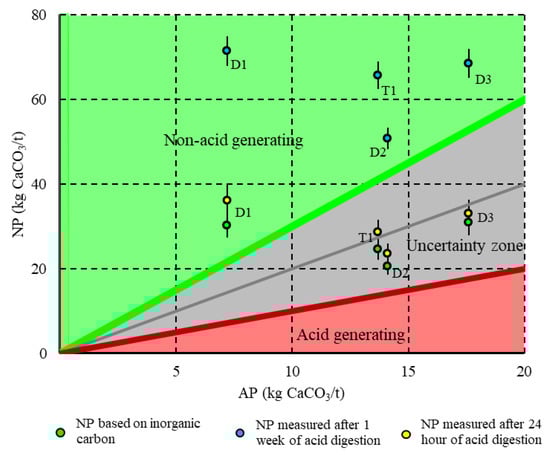 Regarding ABA, the NP after one week of acid digestion was twofold higher than the CNP and the NP measured after 24 h of acid digestion. Therefore, sufficient time was needed for slow-reacting silicates to neutralize acidity and shift samples from the uncertainty zone to the non-acid generating zone (Figure 3). Accordingly, it is recommended to undertake a one-week acid digestion for silicate rich materials. Nonetheless, kinetic testing is required to investigate the reliability of the neutralization potential of the silicates and to quantify the prerequisite lag time to neutralize the sample inherent acidity produced during leaching cycles.