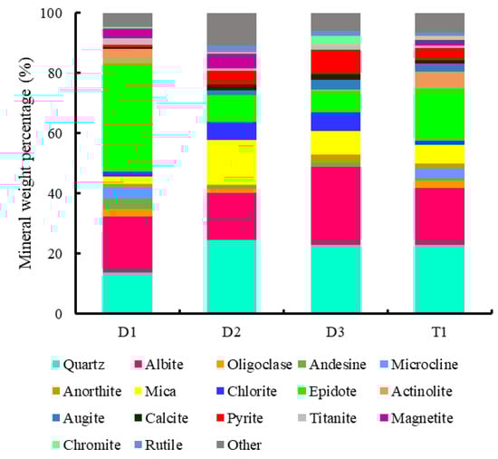The Al content confirmed that the samples were rich in aluminosilicates. The Fe content mainly originated from iron oxides such as magnetite, while iron-bearing sulphides provided a small contribution to the total iron grade as indicated by the sulfur content (Stotal). As no graphite was associated with the Akasaba West deposit, the inorganic carbon content (Ctotal) ascertained that all composite samples were carbonate-poor materials with barely significant differences. However, SEM-EDS investigations highlighted that calcite contained traces of Mn within its crystalline lattice. Calcium exhibited high grades ascribed to epidote that pertains to the greenschist facies mineral assemblage. Figure 4 emphasizes the felsic composition of the Akasaba West host rock with albite contents predominating the mineral assemblage.