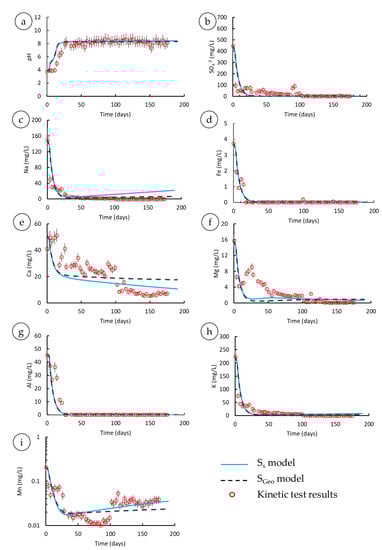 Figure 5 compiles the D2 kinetic modeling and testing results. Generally, a good agreement between the kinetic test data and the PHREEQC model was obtained using De = 8.10−11 m2/s for chemicals diffusing from the grain surface to the bulk solution. The obtained value of De within the water film was roughly one order of magnitude lower than the diffusion of ions in free water. Furthermore, differences between Ss model and SGeo model were scarcely significant. The calibration effort was focused on the specific surface area of albite to alleviate the Na-related discrepancy. Although the BET-based surface area of albite was reduced from 5.31 to 2 m2/dm3, the Na-Ss model was still prone to deviation from experimental results as time progressed (Figure 5). The Na-related discrepancy was substantially decreased using the albite geometric-based surface area (1.63 m2/dm3) (Figure 5).