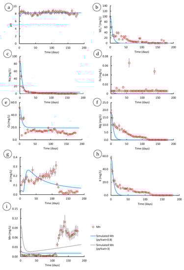 Simulated Mn concentrations completely deviated from the experimental data after the 110th day. The model was not able to capture the Mn evolution in the presence of mineral proportions as low as 0.4% wt of calcite and 0.8% wt of pyrite. The simulated Mn behavior was slightly improved when the pyrite content was increased to 3% wt (Figure 6). In addition to the simulated kinetic processes, perhaps other geochemical processes such as sorption and/or coprecipitation occurred and were overlooked within the PHREEQC model. Plante et al. [17] demonstrated that plagioclase controlled Ni mobility through sorption in waste rock piles of the Tio mine. More recently, Reczek et al. [104] and Trach et al. [105] stated that volcanic tuff and basalt effectively adsorb Mn. Therefore, the next step of the geochemical assessment of Akasaba West materials should involve sorption experiments to investigate the effect of the sorption capacity of plagioclase on water quality.