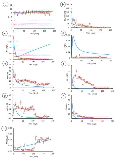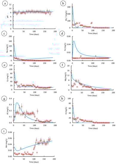 Figure 6. Weathering cells test D1 and PHREEQC modeling results. (a) Experimental and simulated results of the pH. (b) Experimental and simulated results of sulfate. (c) Experimental and simulated results of sodium. (d) Experimental and simulated results of the total dissolved iron. (e) Experimental and simulated results of total dissolved calcium. (f) Experimental and simulated results of total dissolved magnesium. (g) Experimental and simulated results of total dissolved aluminum. (h) Experimental and simulated results of total dissolved potassium. (i) Experimental and simulated results of total dissolved manganese.