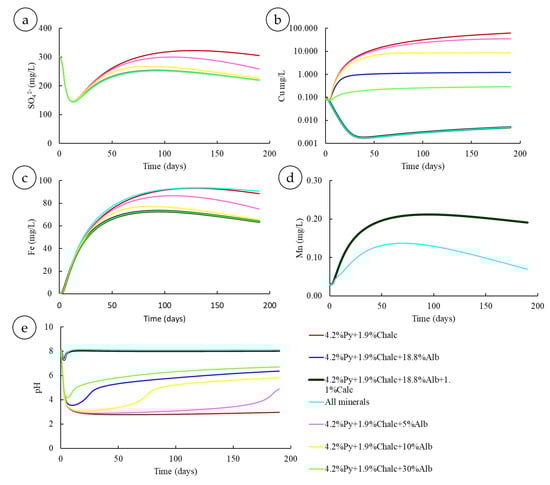 Figure 9. Various scenarios underlining the effect of various mineral assemblages on leachate quality. (a) Sulfate concentrations obtained in the presence of different mineral proportions. (b) Cu concentrations obtained in the presence of different mineral proportions (c) Fe concentrations obtained in the presence of different mineral proportions. (d) Mn concentrations obtained in the presence of different mineral proportions. (e) The pH obtained from the simulated mineral proportion scenarios.
