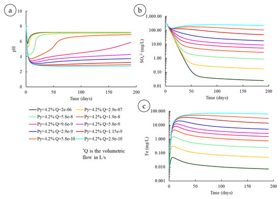 Figure 10. Various scenarios delineating the relationship between the residence time and leachate quality in weathering cell test simulation. (a) The pH obtained for various residence times. (b) Sulfate concentrations obtained for various residence times. (c) Sulfate concentrations obtained for various residence times.