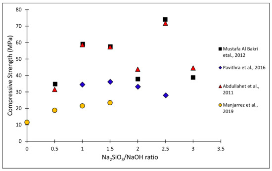 Perera et al. [32] and Steveson and Sagoe-Crentsil [33] obtained compressive strengths of 61 and 48 MPa, respectively, with a Si/Al molar ratio of approximately 2. However, in Steveson’s case, the same strength value is reached with two different ratios (1.75 and 1.90), because the ratio of 1.90 was achieved by adding more sodium silicate to the solution compared to the geopolymer that was designed. Although, with a ratio of 1.75, this result shows that increasing the silicon content in the mixture by means of sodium silicate does not alter the compressive strength.