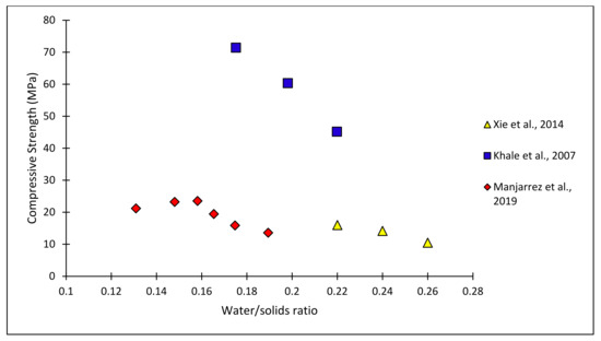 Yunsheng et al. [64] achieved a simple compressive strength of 34.9 MPa with a Si/Al ratio of 2.75, an Na/Al ratio of 1, and an ratio of 7. Rowles and O’Connor [65,66] obtained similar results in two studies (Table 2), obtaining a compressive strength of 64 MPa with a Si/Al ratio of 2.5 and an Na/Al ratio of 1.29.