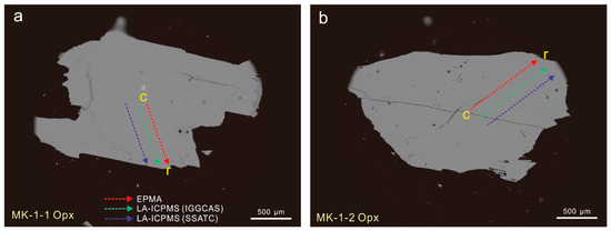 Figure 1. Representative backscatter electron (BSE) images of MK-1 orthopyroxene. (a), MK-1-1; (b), MK-1-2. The red lines show the core-to-rim profiles of EPMA analyzed spots, the green lines represent LA-ICPMS analyzed spots obtained from IGGCAS, and the purple lines represent LA-ICPMS analyzed spots obtained from SSATC.