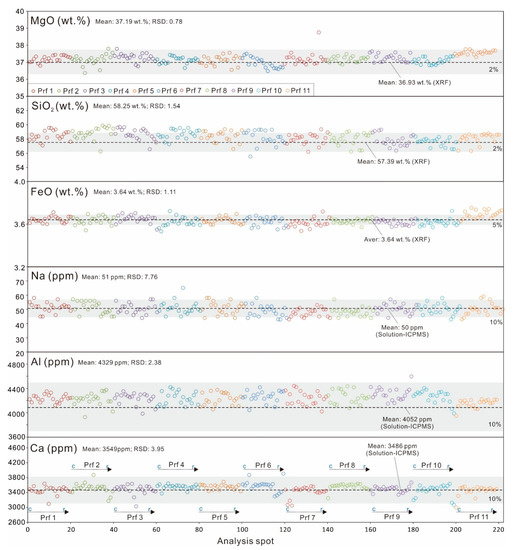 The homogeneity of major and trace elements is a fundamental requirement of any reference material [20,33,34,35]. In order to test the homogeneity of the orthopyroxene grains, eleven core-to-rim profiles (220 spots) were carried out by EPMA, and twelve core-to-rim profiles (240 spots) were carried out using LA-ICPMS by two institutions (Figure 1). Tables in this study list all analytical results provided by each laboratory, including major and trace elements mass fractions, mean values, standard deviation of mean (SE), relative deviation of mean (RSE), and relative standard deviations (RSD), displaying the dispersion of the data. Figure 2, Figure 3, Figure 4, Figure 5 and Figure 6 show EPMA and LA-ICPMS mass fraction data of the profiles measured for the studied samples.