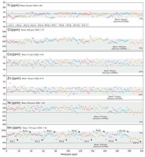 30. Liu, Y.S.; Hu, Z.C.; Gao, S.; Günther, D.; Xu, J.; Gao, C.G.; Chen, H.H. In situ analysis of major and trace elements of anhydrous minerals by LA-ICP-MS without applying an internal standard. Chem. Geol. 2008, 257, 34–43. [Google Scholar] [CrossRef]