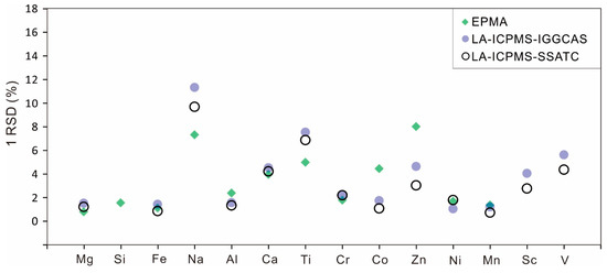 Figure 4. EPMA and LA-ICPMS homogeneous data for MK-1 orthopyroxene. The relative standard deviations (RSDs) display the dispersion of the data.