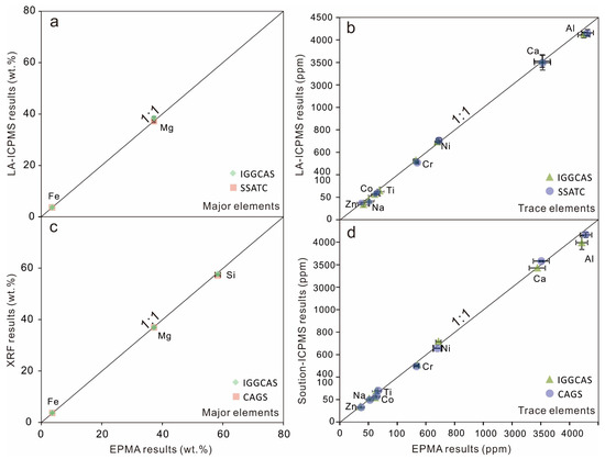 Figure 6. Comparison of major and trace element abundances determined by EPMA, LA-ICPMS, XRF, and solution-ICPMS techniques. A 1:1 line is drawn in each plot for comparison purposes. EPMA data show outstanding agreements with XRF and LA-ICPMS results obtained by different laboratories with RSE < ±2% for major elements (a,c) and with RSE< ±10% for trace elements (b,d).