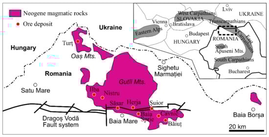 Geological sketch map of the Oaş–Gutâi Mountains, showing the location of the ore deposits in the Baia Mare metallogenetic district associated with Neogene volcanism. The inset shows a general map of the Carpathian region and location of the Baia Mare metallogenetic district (with modification after [21]).