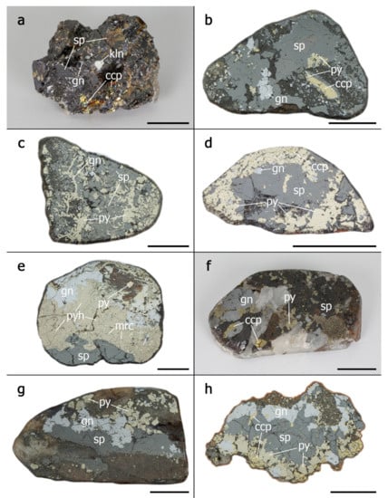 Macrophotographs of representative mineral assemblages of the polymetallic mineralization from the Baia Mare–Oaș metallogenetic district: (a) Ghezuri; (b) Ilba; (c) Nistru; (d) Săsar; (e) Herja; (f) Baia Sprie; (g) Cisma-Banduriţa; (h) Cavnic. Abbreviations: sp—sphalerite; py—pyrite; gn—galena; ccp—chalcopyrite; kln—kaolinite; mrc—marcasite; pyh—pyrrhotite. The scale bar—1 cm.