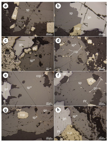 Plane-polarized reflected light photomicrographs of representative mineral assemblages of the polymetallic mineralization from the Baia Mare–Oaș metallogenetic district: (a) Turţ-Penigher; (b) Ilba; (c) Nistru; (d) Dealul Crucii; (e) Baia Sprie; (f) Cisma; (g) Şuior; (h) Cavnic. Abbreviations: sp—sphalerite; sp*—sphalerite with chalcopyrite disease; py—pyrite; gn—galena; ccp—chalcopyrite.