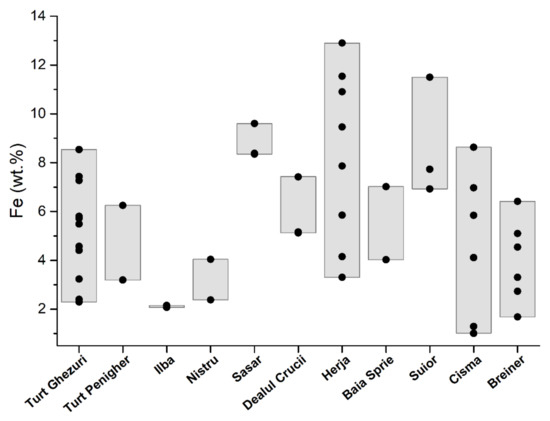 The maximum iron content in sphalerites in the Baia Mare area is 12.9 wt.%. Ref. [10] showed iron concentrations reaching up to over 15% by weight. In epithermal, low-sulfidation mineralizations in the Apuseni Mountains (Golden Quadrilater Romania) with mineralizations of Au veins and magmatic breccia and significant base-metal ore, sphalerites contain iron between 0.06 and 10.44 wt.% [10]. These contents are much lower than those in the metallogenetic districts of Baia Mare and Oaş (Table 1). Similar contents (1.31–8.48 wt.%) were reported for the Čumavići polymetallic ore deposit (Bosnia) by [46].