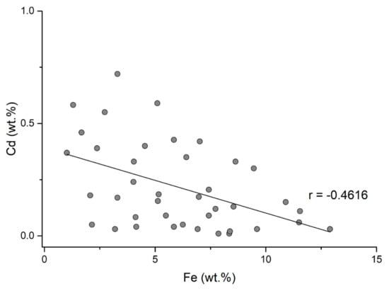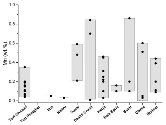 The Băiuţ area is situated in the easternmost part of the Baia Mare region. We studied the sphalerite from two deposits: Breiner and Cisma. The ore deposits as veins are located in Paleogene sediments intruded by the Pannonian quartz micro-monzodiorite and micro-granodiorite porphyries [40]. The sphalerite appears to be associated and intergrown with chalcopyrite, pyrite, and galena, but it is identified as sphalerites bounded in carbonate [41]. The sphalerite from the Breiner deposit is characterized by low content in Fe that ranges from 1.68 wt.% to 6.41 wt.% (Table 1; Figure 5). The manganese was detected in small amounts (from 0.09 wt.% to 0.44 wt.%) and does not correlate with iron content (Table 1; Figure 6). Cadmium is present in appreciable quantities (from 0.35 wt.% to 0.72 wt.%) (Table 1; Figure 7).