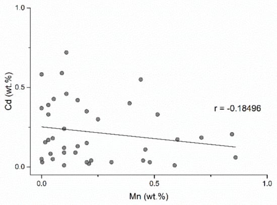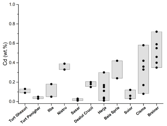Cadmium frequently occurs as a solid solution in sphalerite. The cadmium content is quite uniform in the Baia Mare and Oaş areas with contents ranging from 0.01–0.72 wt.%. The correlation between Cd and Fe and Cd and Mn (Figure 14 and Figure 15) is negative and indicates that cadmium replaces zinc in sphalerite with low iron and manganese contents. Cadmium replaces zinc due to the similarity of their covalent rays (Zn2+ = 1.31 Å; Cd2+ = 1.48 Å) and the sulfur affinity of cadmium which is similar to that of zinc. The correlation between cadmium and manganese (Figure 15) is insignificant because these elements independently replace iron in sphalerite. Iron-rich sphalerites from Herja, Şuior, and Săsar contain small amounts of cadmium. Another peculiarity is sphalerite from gold mineralization from Dealul Crucii, which contains quite a lot of iron and also contains appreciable amounts of cadmium. Additionally, sphalerites from the eastern part of the Baia Mare area (base-metal and copper mineralization from Cisma and Breiner) incorporate the highest amounts of cadmium.