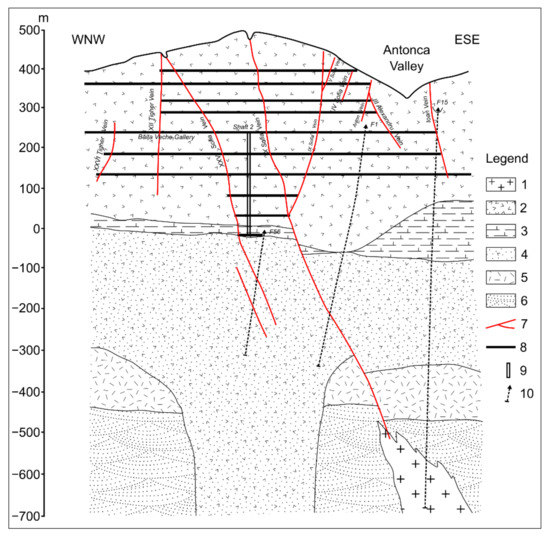 Crosssection through Sofia–Propad (Săsar) stratovolcanic structure ([33] with modifications). 1—Porphyry microdiorites; 2—Quartz bearing andesite (Pannonian); 3—Pyroxene andesites (Sarmatiane age); 4—Ryodacite pyroclastic rocks (Lower-Badenian age); 5—Pannonian marls; 6—Badeniane; 7—Eocene sedimentary formations; 7—Veins; 8—Gallery; 9—Shaft; 10—Drillings.