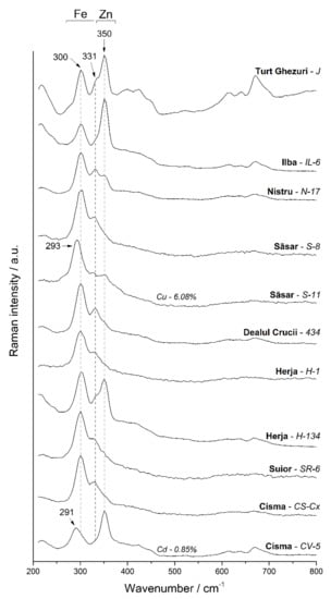 Previous studies showed that there is a linear correlation between these intensities and therefore they can be used for semi-quantitative determinations [37]. For the sphalerite samples with Mn content in the crystal lattice, the Raman peaks become slightly broader with increasing Mn concentration, which is in agreement with the observations in [43]. Two Raman spectra revealed a slight shifting of the 300 cm−1 modes to lower wavenumbers (Figure 10, CV-5 and S-11 samples). This might be due to the presence of additional cations in the chemical composition, since these samples have higher contents of Cu (6.08 wt.%)—S-11 and Cd (0.85 wt.%)—CV-5, respectively. The influence of Cd on the Raman spectra of sphalerite was reported by [42,44] showing that the peak assigned to Cd–S bonds is found at 285–295 cm−1. Nevertheless, in natural sphalerites, coupled substitutions are present due to the complexity of natural hydrothermal systems. Therefore, this mode could be affected not only by Cd but also by other several cations present in the crystal structure producing this shift to lower wavenumbers.
