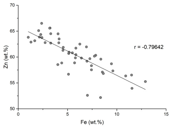 Substitution of zinc with minor elements in the structure of sphalerite depends on the similarity of the covalent rays of those elements and their affinity for tetrahedral coordination. The correlation between iron and zinc from sphalerite from the metallogenetic district of Baia Mare and Oaş is strongly negative (Figure 11). The negative correlation shows that iron is the main element that replaces zinc in the sphalerite structure. This substitution is possible because the cation radii of zinc and iron are similar (Fe2+ = 1.25 Å; Zn2+ = 1.31 Å) which favors the substitution of zinc. The interatomic distance at Fe-S is greater than at Zn-S [4]. Isomorphic substitution of zinc with iron causes an increase in the reticular parameter a of sphalerites [47] with increasing iron content. Kullerud (1953) [4] and Barton and Kullerud (1958) [48] indicated that the ability of FeS to replace ZnS depends on the increase in temperature.