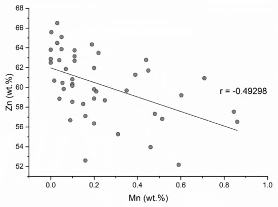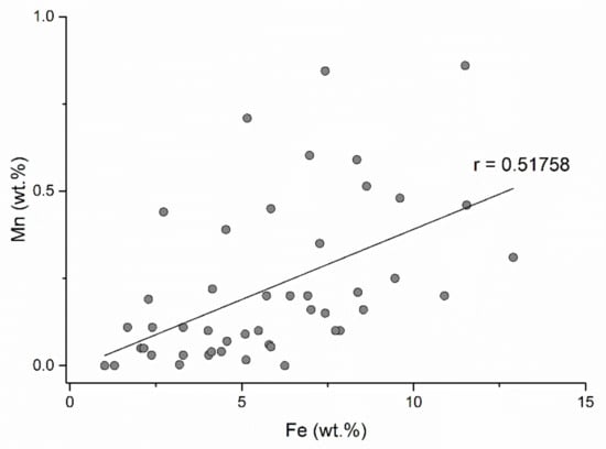The highest manganese content of sphalerites in the Baia Mare and Oaş area is 0.84 wt.% (in the Dealul Crucii epithermal gold deposit) (Table 1). The correlation between Zn and Mn (Figure 12) is negative indicating that the incorporation of manganese takes place by simple cation exchange (Zn2+Mn2+). The incorporation of MnS into the sphalerite structure is in the form of a solid solution. Alabandite MnS is not isostructural with sphalerite and the manganese contents entering the sphalerite structure cannot be very high. According to the data presented by [50], the MnS contents of the sphalerite structure cannot exceed 7 mol%. There is a good correlation between iron and manganese (Figure 13), indicating that the substitution of Zn2+Fe2+ is accompanied by Zn2+Mn2+. These double substitutions are possible because the cation radii of zinc, iron, and manganese are similar (Zn2+ = 1.31 Å; Fe2+ = 1.25 Å; Mn2+ = 1.39 Å). Cook et al. (2009) [10] reported a content of 6.7 wt.% Mn in sphalerite in epithermal gold deposit from Roşia Montana (Romania). These contents exceed the maximum value indicated by [50].