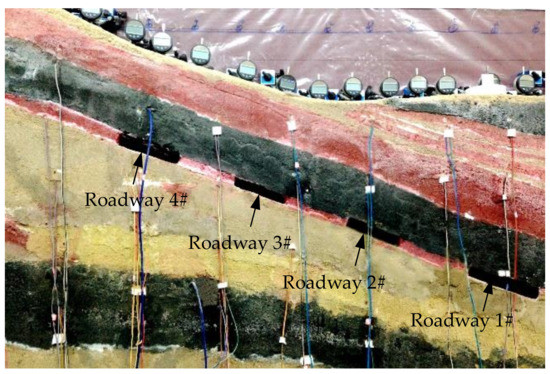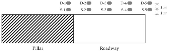 In the physical similarity simulation test model, the XL2101G multi-point high-speed whole process controlled static strain acquisition system was used to monitor the vertical strain of the surrounding rock. The layout of sampling points for vertical strain is shown in Figure 2. In addition, a mini stress meter was used to detect the rock stratum pressure. The sample and instrument were consistent with the ambient temperature before the test, and we ensured that the laboratory was closed during the test. The mining of a certain sub rock stratum was carried out, and the layout of the ore room adopted a “mining one by one” approach in the simulated mining test [30]. The design width of pillar and stope was 15 m. To simulate the explosion process of the rock surrounding the roadway during roadway excavation, continuous mining without backfilling was selected for the test; that is, while maintaining the consistency of roadway section shape and size and the spacing distance between two adjacent roadways, the elastic strain energy of the simulated roadway-surrounding rock continues to accumulate and increase.