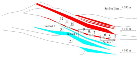 Schematic diagram of physical simulation test. Legend:1—Ore deposit V1; 2—Ore deposit V2 and V3; 3—Ore deposit V1; 4—Roadway1#; 5—Pillar 1#; 6—Roadway2#; 7—Roadway3#; 8—Pillar 2#; 9—Roadway4#; 10—Roadway5#; 11—Pillar 3#; 12—Roadway6#.