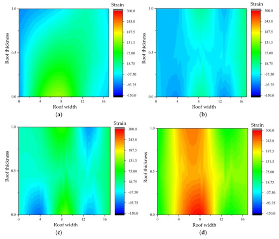 Considering that the inner wall of the roadway after excavation showed σ3 = 0, the roadway buckling failure satisfies σθmax = σ1 = σci; that is, in theory, when the tangential stress of surrounding rock around the roadway reaches the uniaxial compressive strength, the roadway will be damaged. However, in our experimental study, we found that the buckling failure strength of the roof from the first to third time steps was σθmax ≈ (1.29–1.76) σci, as shown in Table 5. This is also consistent with previous research results at home and abroad. The results of the analysis are due to the influence of the size effect and the strong effect on the roof after roadway excavation [35,51,52].