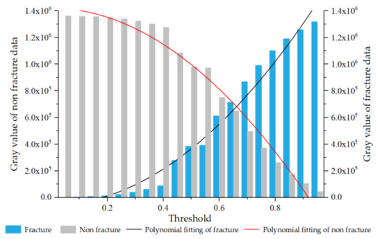 The gray value calculation method was used to determine the micro data of rock mass fractures. Through normalization of the sampling data from the five monitoring points in the first mining time step, the micro data of rock mass fractures were accumulated and calculated, respectively, according to F = (0.05, 0.10, 0.15, … , 0.90, 0.95). Combined with the polynomial fitting of fracture and non-fracture data, F = 0.35 was determined as the cross-scale transformation threshold from macro to micro data of rock mass damage, as shown in Figure 8.