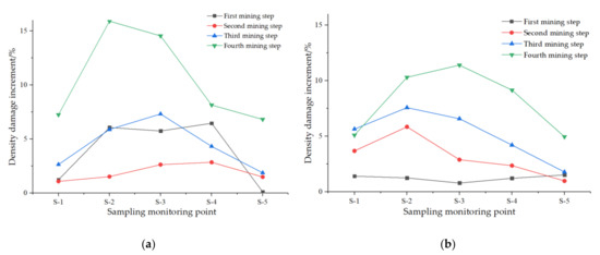 Density damage of roadway roof in (a) near roadway roof sampling points and (b) deeper sampling points.
