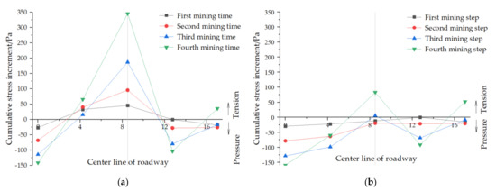 Cumulative stress increment of roadway roof-surrounding rock: (a) Near roadway roof sampling points and (b) deeper sampling points.