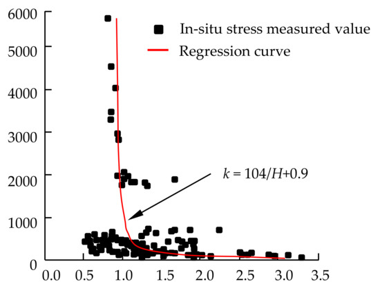 In this paper, the regression analysis equation of Zhao D.A. for the ratio of average horizontal in situ stress to vertical in situ stress of sedimentary rocks in China was selected [56], as is shown in Figure 14.