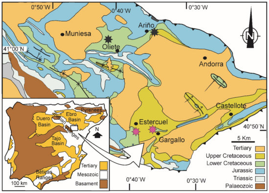 - Querol, X.; Salas, R.; Pardo, G.; Ardevol, L. Albian coal-bearing deposits of the Iberian Range in north eastern Spain. In Controls on the Distribution and Quality of Cretaceous Coals; McCabe, P.J., Totman, J.P., Eds.; Geological Special Paper 267; Geological Society of America: Boulder, CO, USA, 1992; pp. 193–208. [Google Scholar]