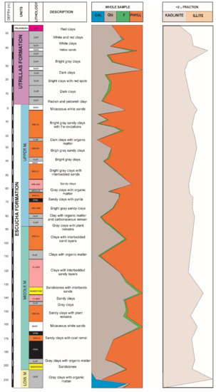 According to the XRD study, these rocks consist of quartz, kaolinite, and illite, with accessory feldspars (<5%). Calcite is only present at the bottom of the sections; the rest of the levels do not have carbonates (Figure 2). The relative proportions of each phase vary in the different lithologies. Usually, the kaolinite contents in the <2 µm fraction range from 30% to 60%, and usually its contents are higher than those of illite, the mean value of the Kln/Ilt ratio being 1.5 (Figure S1). The treatment used to check the presence of halloysite gave a negative result.