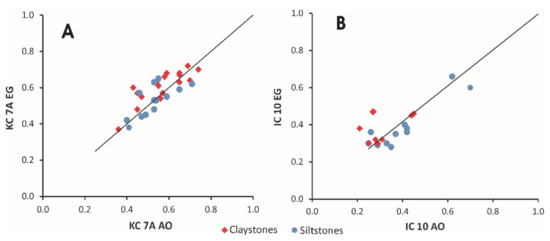 (A) Kln crystallinity measured in AO samples vs Kln crystallinity measured in EG samples. (B) Illite crystallinity measured in AO samples vs. illite crystallinity measured in EG samples, both in clays and silts.