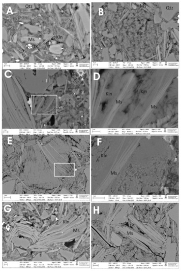 Figure 5C,D, which is an enlargement of Figure 5C, show that the kaolinite is mainly on the edges of the intergrowths, suggesting that the mica is being replaced by kaolinite. Similar textural relations between these two phyllosilicates are also observed in Figure 5H. In large mica-kaolinite intergrowths, the kaolinite grows between cleavage sheets of pre-existing detrital mica. This produces the displacement of the mica sheets (Figure 5G). Intergrowths formed mainly of kaolinite, constituting booklet-type aggregates with only some mica relicts are also observed (Figure 5E,F). These textural relations suggest a more advanced process than that observed in Figure 5D,H. In some cases, the continuity of the thin packets of muscovite is more diffuse, and they seem to disappear into a kaolinite matrix (Figure 5F). Similar aggregates of lower size are observed forming the matrix but, in this case, they are only made up of kaolinite plates (Figure 5B).