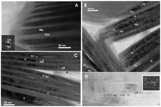 High Resolution TEM images and SAED patterns (insets of mica-kaolinite intergrowths (A–C) and 10 Å to 7 Å layer transitions (D).