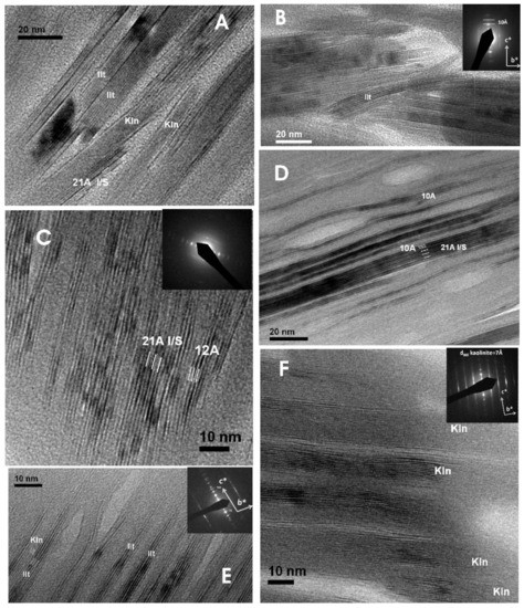 According to the HRTEM images, the clay matrix is quite heterogeneous. There are some areas with parallel to subparallel illite and kaolinite packets, with thicknesses ranging from 5 to 20 nm (Figure 7A). On occasion, kaolinite or illite form mixed layers with I-S phases, and their lattice fringe images show abundant layer terminations. In other zones, as Figure 7B illustrates, there are frayed oblique illite packets that show disordered SAED suggesting a 1 Md polytype. Complex mixed-layered minerals formed by Sm-layers and IS phases are also observed in HRTEM images of the matrix (Figure 7C), and they also show disordered polytypes (1 Md type). In Figure 7D, a number of IS phases are interstratified with illite layers (10 Å spacing). Random mixed-layered illite/kaolinite are visualized in Figure 7E; the presence of layer terminations in the images and the SAED patterns indicate that they are defective structures. Pure kaolinite areas are also observed (Figure 7F). The layer terminations and non-straight lattices observed in the HRTEM images of kaolinite along with the disordered polytypes (SAED patterns) suggest that the kaolinite has low crystallinity.