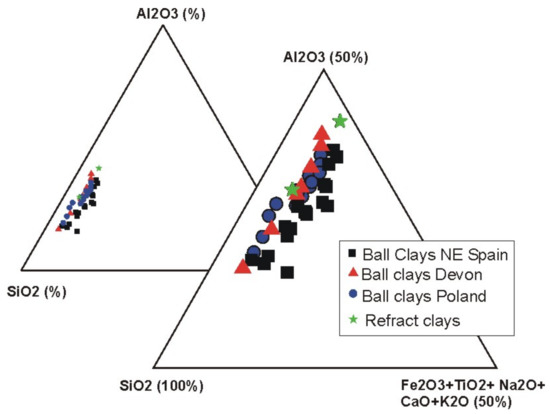 Plot of the chemical composition of the ball clays from NE Spain (this study), ball clays from Devon [1], ball clays from Poland [9], and refractory clays [24]. (Table S1).