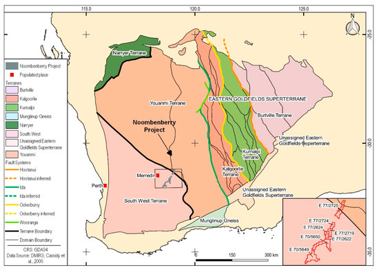 Terranes of the Yilgarn Craton, the Noombenberry Project in grey, predominantly lying in the South West Terrane, modified after [20].