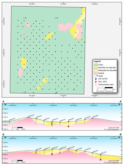 Overview of the surface, drill holes, and undulating fresh granite contact; (A) cross-section along 671 494 E (B) cross-section along 673 486 E.