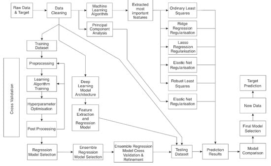 The objective was to model and predict the kaolinite and halloysite percentages using the geochemical analysis, spectral, and brightness data. Over 50 Python (v3.8) ML and TensorFlow/Keras deep-learning models were trained on the data and eventually reduced to just one ensemble model, comprising five key base regression models, used in a final voting regression model (Figure 3).