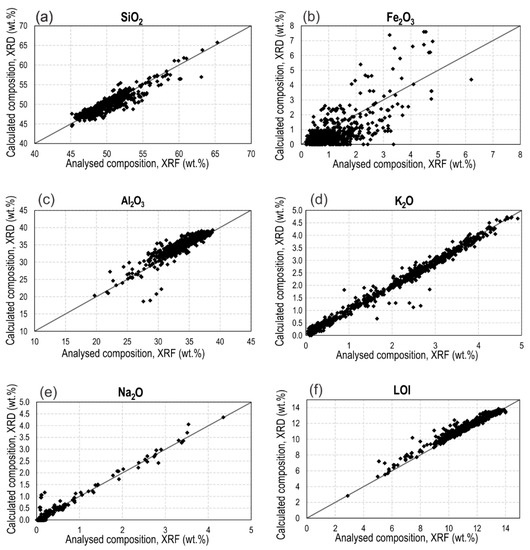 Bulk composition plots for XRF value vs. calculated bulk composition from XRD data for the main components: (a) SiO2; (b) Fe2O3; (c) Al2O3; (d) K2O; (e) Na2O; (f) LOI (H2O + CO2). The one-to-one line is shown.