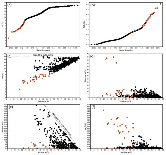 (a) Normal probability plot for LOI (<8.75% coloured orange in this and following panels); (b) normal probability plot for SiO2; (c) kaolinite (wt.%) vs. LOI (wt.%); (d) kaolinite (wt.%) vs. muscovite (wt.%); (e) kaolinite (wt.%) vs. halloysite (wt.%); (f) kaolinite (wt.%) vs. Na2O (wt.%).