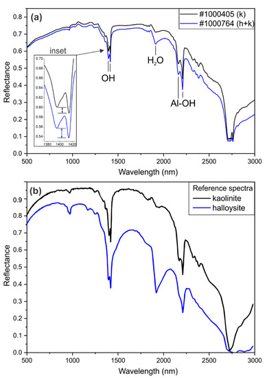 (a) Extracts of representative FTIR spectra from the project for samples 1000405 (98 wt.% kaolinite) and 1000764 (51 wt.% kaolinite, 44 wt.% halloysite). Note the differences in the H2O intensities and OH-doublets. The inset illustrates the OH stretching band intensity ratio (c.f. [31]); (b) reference spectra from the USGS spectral library [42], for kaolinite (splib07a rec = 6043) and halloysite (splib07a rec = 4695).