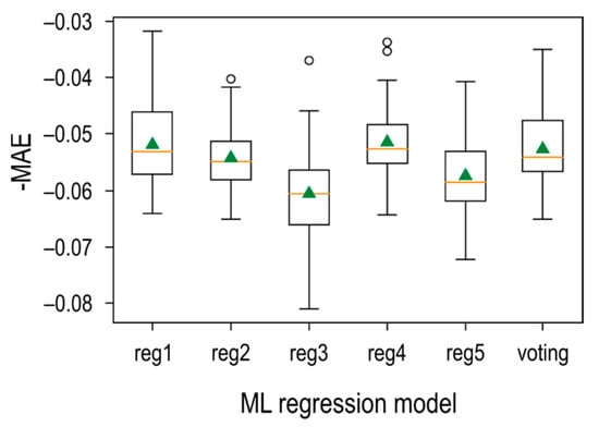 Multiple models were assessed to identify the best approach to predict kaolinite (wt.%) from Fe2O3 (wt.%), Al2O3 (wt.%), SiO2 (wt.%), TiO2 (wt.%), CaO (wt.%), K2O (wt.%), Na2O (wt.%), MgO (wt.%), P (wt.%), LOI (wt.%), brightness, and FTIR spectra from 350–44,701.59 nm. To assess the model performance, the mean absolute error (MAE) was used along with the R2. The MAE is a measure of how big an error can be expected from the forecast on average and is robust to data with outliers. In ML, negative MAE is used for optimisation, with a value of 0 representing no errors. Models are ranked from best to worst in the table below (Table 2). The ML ensemble model provided the best prediction performance. In contrast, the other six models (RLS, EN, Lasso, RR, OLS, and EN PCA 5) produced simpler, easily explainable models, but with lower accuracy (Table 2). The high dimensional data used for modelling here, in which the number of features (p) is much larger than the number of observations (n), is handled much better by the ML algorithms, which can analyse high dimensional non-linear systems much better than the rest of the modelling methods. The ML ensemble model evaluation was completed by shuffled K-fold model cross-validation (K number of splits = 10, repeats = 3) of the test data (20% of the full dataset). Boxplots of these results are presented in Figure 7.