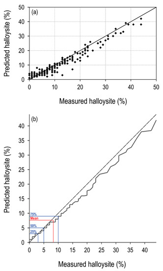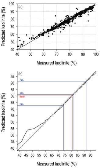 The QQ plots (Figure 8 and Figure 9) reveal a bias with low kaolinite abundances having higher predicted abundances than measured (average bias of ~10% below 60 wt.%); correspondingly, high predicted halloysite abundances are slightly higher than measured halloysite abundances. Most of the samples examined in this dataset (85%) have kaolinite abundances >65 wt.% and <7% halloysite. At these abundances, the ML prediction is robust, as highlighted by the excellent R2 values for the comparison between predicted and measured values. The lack of high halloysite samples that would enable the prediction to be robust at these abundances could be addressed through additional targeted sampling; to add more high-halloysite, low-kaolinite samples to the population, the models can then be regenerated. This approach is preferable to any synthetic up-sampling or down-sampling approach to deal with the distribution of the population used to train models. Any modelling approach will always be limited by the data available, and the present case is no different.