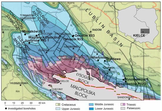 The Paleozoic core of the Holy Cross Mountains is surrounded on the southwest, north, and northeast by Mesozoic formations, the so-called Mesozoic margin composed of Triassic and Jurassic deposits. Its boundary is marked by the outcrops of Paleozoic rocks in the Holy Cross region. Lying at the boundary of tectonic units that ultimately formed at the end of the Alpine orogeny, the northern area of the Mesozoic margin is part of the Gielniów segment of the Holy Cross Swell [], whereas its northeastern area is part of the transition zone from the Mid-Polish Swell to the Marginal Trough [,]. As we move away from the boundary of the Paleozoic outcrops, younger and younger Triassic rocks and then successively younger and younger Lower, Middle, and Upper Jurassic formations appear under the Cenozoic [].