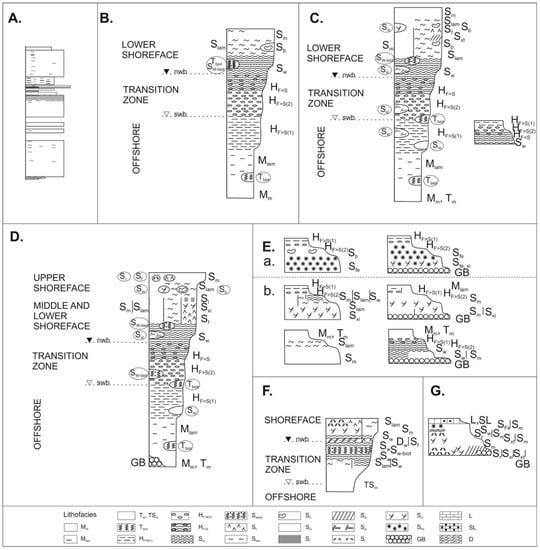 Vertical sequences of lithofacies observed in different stratigraphic divisions: (A) exemplary profile of the Lower Aalenian, (B) Upper Aalenian–Lower Bajocian, (C) Upper Bajocian, (D) Lower and Middle Bathonian—coarsening-up cycles, (E) Lower and Middle Bathonian—finning-up cycles; (a). cycles with green colour chamosite sandstones (lithofacies SFe), (b). cycles without green colour chamosite sandstones (lithofacies SFe), (F) Upper Bathonian–Callovian—coarsening-up cycles, and (G). Upper Bathonian–Callovian—finning-up cycles. Symbols of lithofacies and their descriptions are as in Table 1. nwb—normal wave base; swb—storm wave base; SFe—Fe.