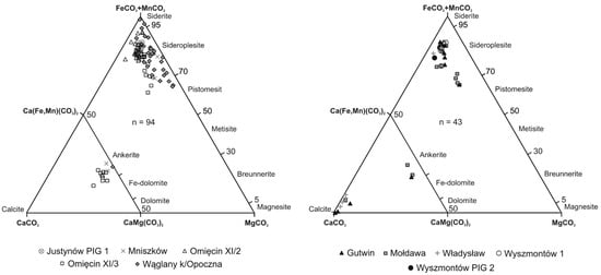 The clayey siderites contain not only sideroplesite but also clay pelite (0–35 vol.% of rock), impregnated in places with organic matter or iron hydroxides. Clay minerals that occur in siderites are represented by very fine, colorless, low-birefringent flakes, probably representing mainly kaolinite. The green and yellow clay minerals represent berthierine and illite, as evidenced by X-ray studies []. Ankerite and less frequent calcite occur in varying amounts in the clayey siderites. The mineral composition of carbonate cements from the tested samples is presented in Table S2 and in the classification triangle (Figure 4). Quartz grains of the aleurite and psammite fractions account for 1.0–49.0 vol.% of rock, while feldspar grains (microclines), mica flakes (muscovite), coalified plant remains, and pyrite concentrations usually do not exceed 1.0 vol.%. Accessory constituents are also represented by zircon. The highest content of plant debris was recorded in the Wyszmontów PIG 2 borehole (depth 30.7 m-6.3 vol.%). A large amount of pyrite (12.7 vol.% was found at a depth of 125.0 m in the Wyszmontów 1 borehole.
