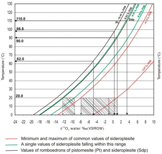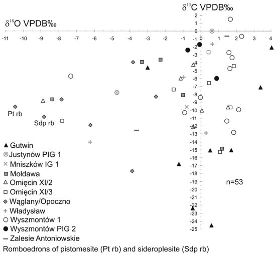Determination of the oxygen and carbon isotopes was also performed in the calcite cement of sideritic sandstone of the Wyszmontów 1 borehole. The δ13C value is −11.15‰VPDB, and the δ18O value is −4.45‰VPDB (26.27‰VSMOW, Table S5).